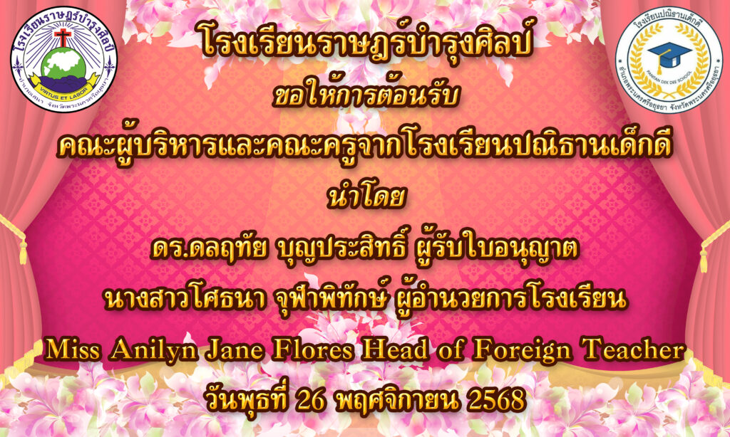 26 พฤศจิกายน 2568 คณะผู้บริหารและคณะครูจาก โรงเรียนปณิธานเด็กดี นำโดย ดร.ดลฤทัย บุญประสิทธิ์ ผู้รับใบอนุญาต มาเยี่ยมเยียนและให้กำลังใจ โรงเรียนราษฎร์บำรุงศิลป์ ซึ่งได้รับผลกระทบจากอุทกภัยน้ำท่วมในช่วงนี้
