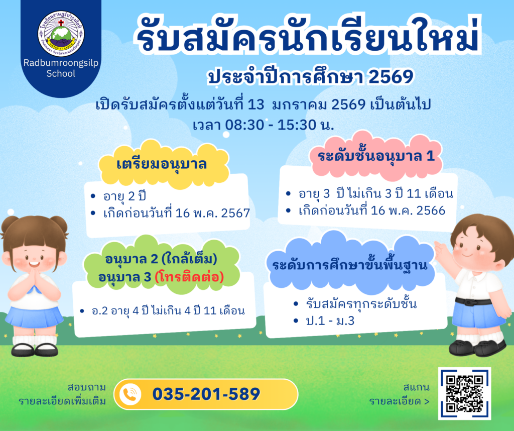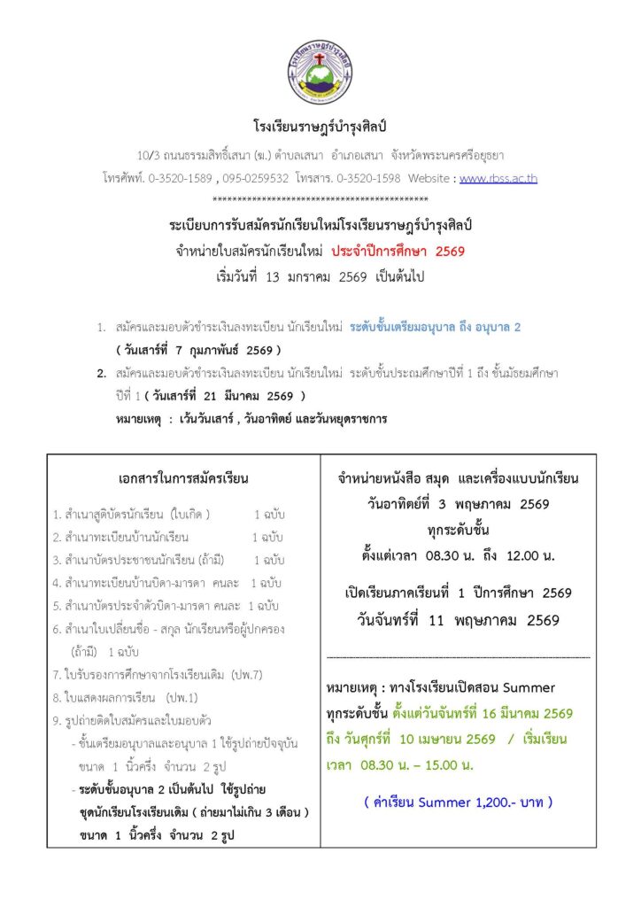 ระเบียบการรับสมัครนักเรียนใหม่โรงเรียนราษฎร์บำรุงศิลป์